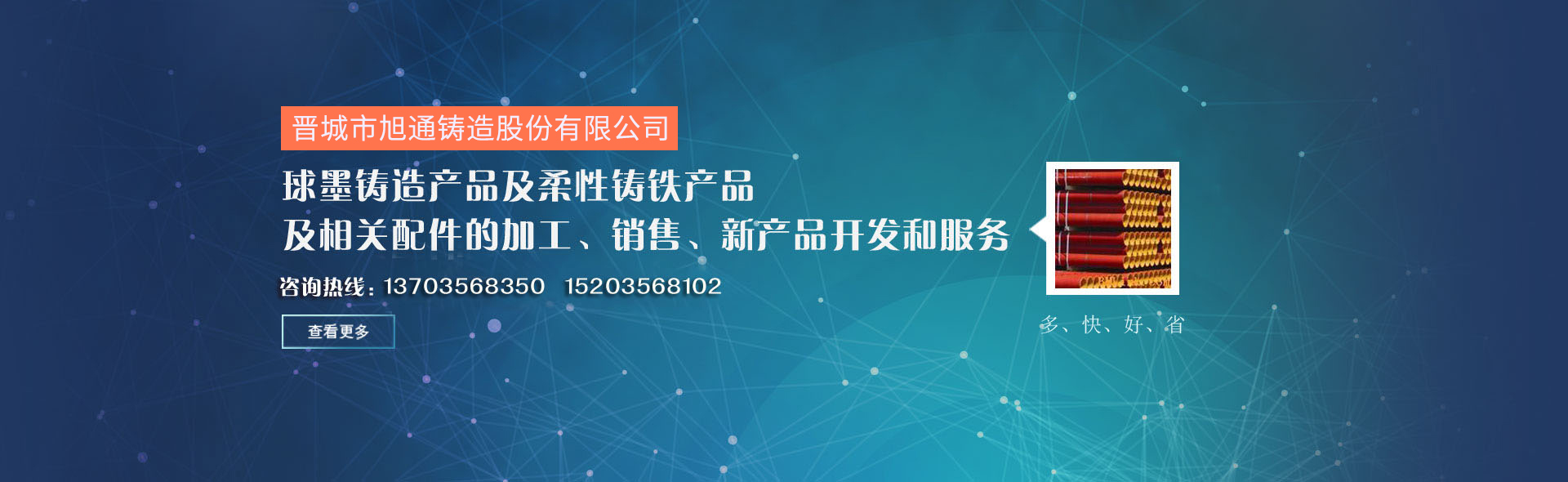 晉城市旭通鑄造股份有限公司是一家致力于球墨鑄造產(chǎn)品及柔性鑄鐵產(chǎn)品及相關(guān)配件的加工、銷售、新產(chǎn)品開發(fā)和服務(wù)的網(wǎng)絡(luò)平臺,以“多、快、好、省”為服務(wù)宗旨,多種選擇、快速定位、優(yōu)質(zhì)產(chǎn)品、省錢省力,為客戶提供精準(zhǔn)服務(wù)......